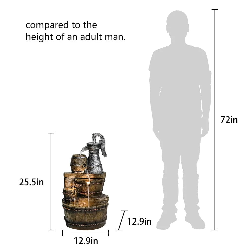 Bring rustic charm to your outdoor space with the Rustic Barrel Five Tier Outdoor Fountain With LED Lights. This durable outdoor fountain blends classic craftsmanship with modern function to create a soothing focal point in any garden, patio, or courtyard.