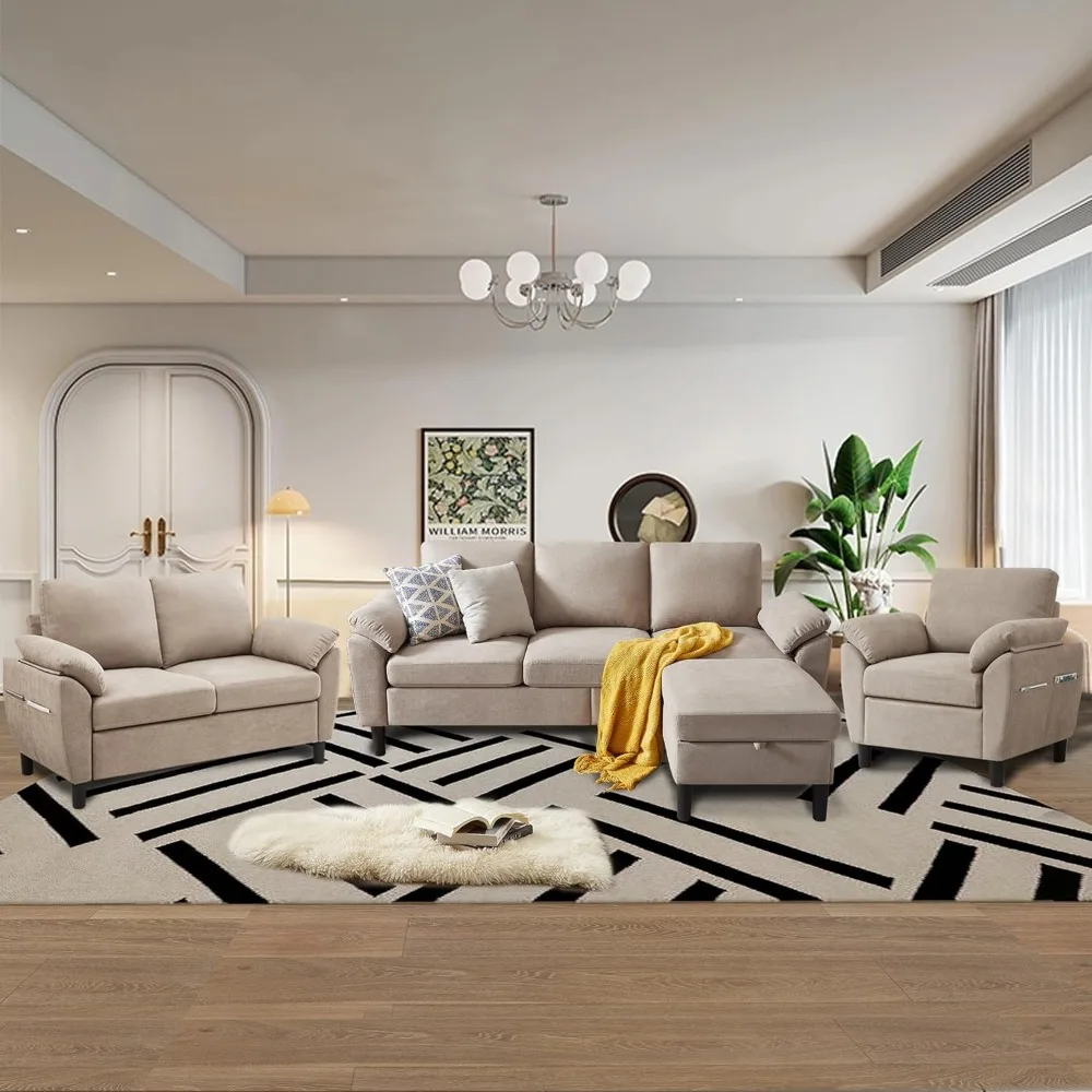 4 Piece Convertible Sectional Sofa Set, Modern Linen Small L Shaped Couch with Reversible Chaise, 3-Seater Sofa & Loveseat & Arm