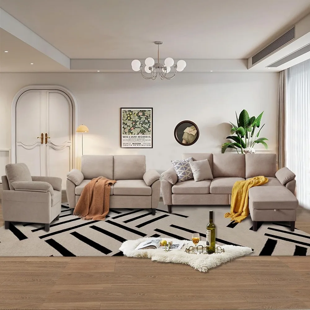 - Comfortable Sectional Sofa: The L-shaped sofa features a medium hardness cushion filled with high-density sponge and springs. This compact three seater sofa provides excellent support and elasticity, preventing it from sagging or sinking over time. It also features soft cushions and armrests, providing continuous comfort