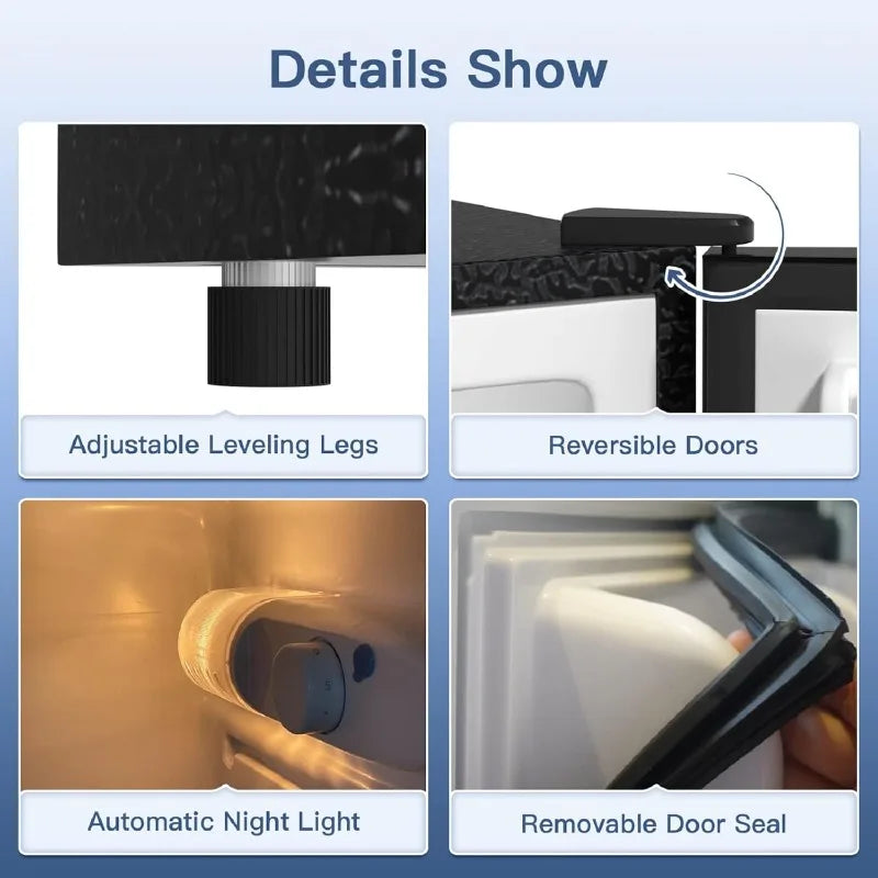- Thoughtful Details: This small refrigerator features reversible doors for your convenience. The automatic LED helps you easily find items in the dark. Bottom leveling legs ensure stable placement on uneven floors. The removable door seal simplifies cleaning. An ice tray and defrost tool are also provided.