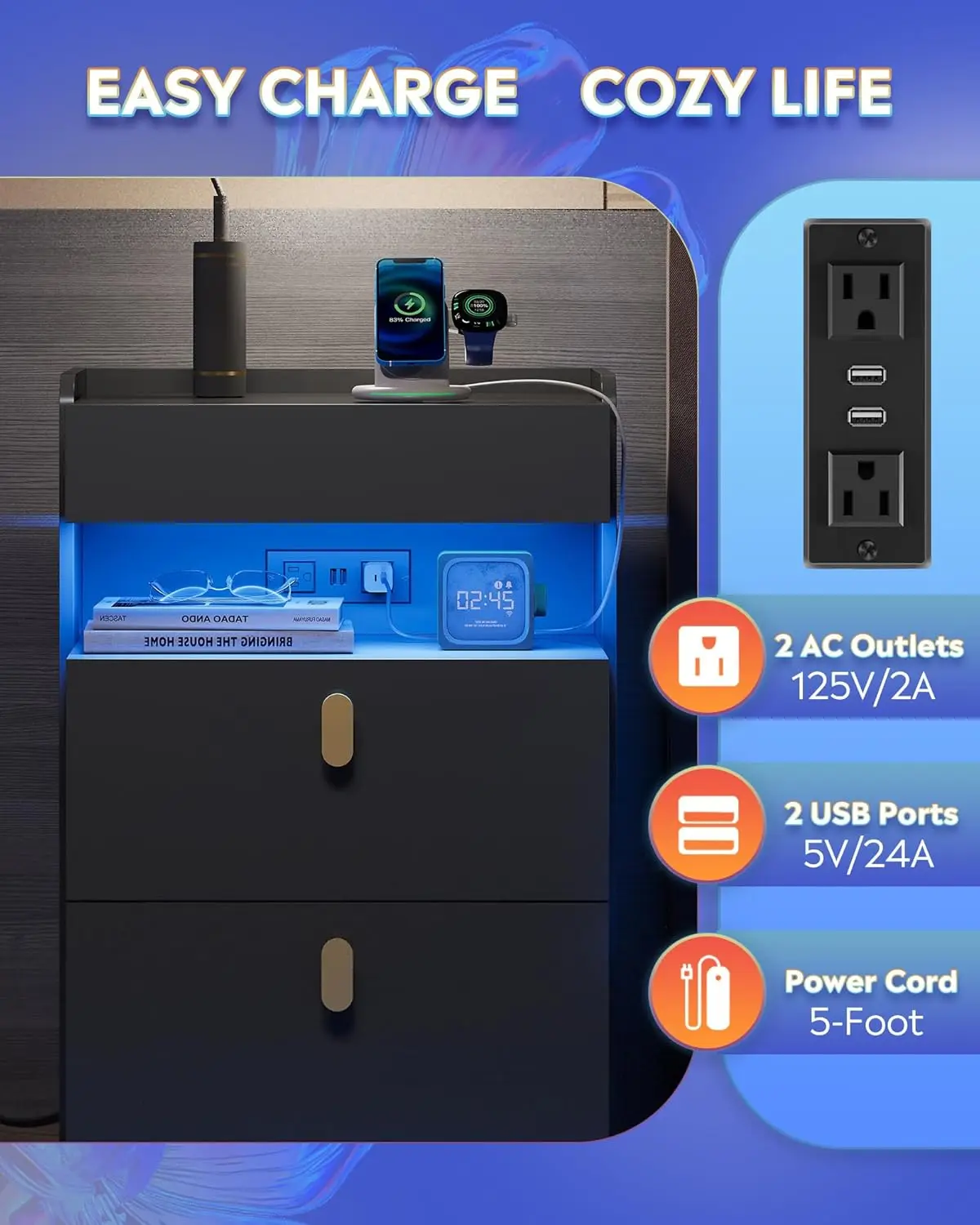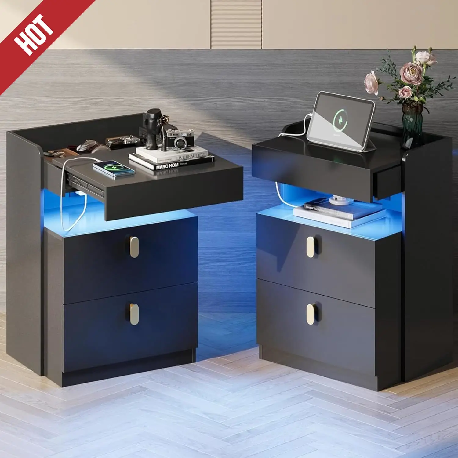 Nighstand Set of 2 with Charging Station, LED Night Stands Sets with Sliding Top, Bedside Tables with Drawers, End Table for Bedroom, Living Room, Black