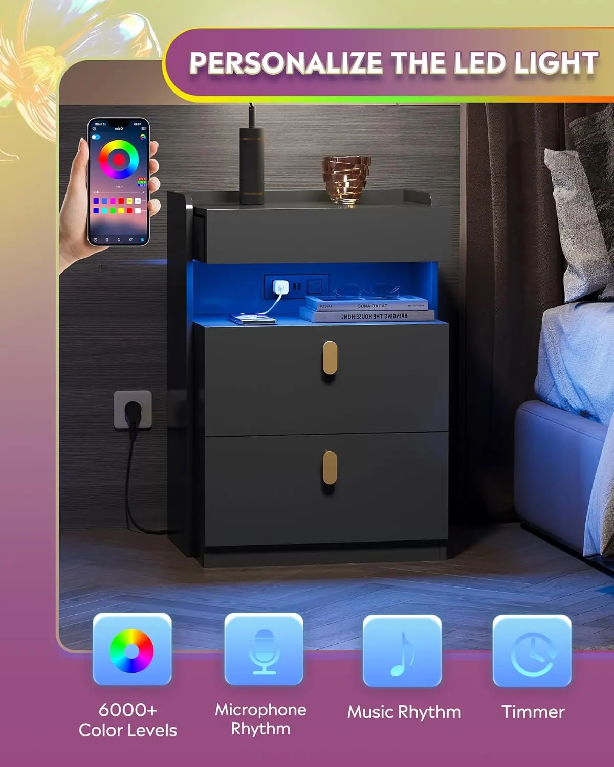 - 【LED Nightstand】This black nightstand features a multi-color light strip controlled via a mobile app. Adjust brightness and colors for a relaxing atmosphere, perfect as a modern bedroom nightstand table.