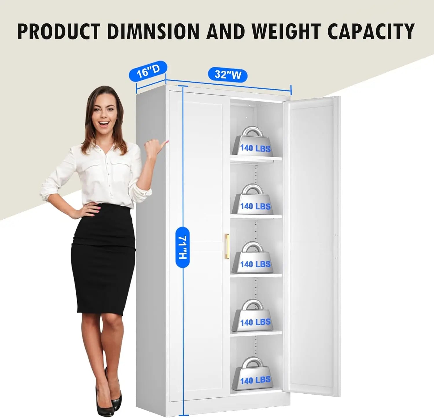 - LARGE CAPACITY & FLEXIBLE STORAGE: The size of this storage cabinet with doors and shelves is 71"H x 32"W x 16" D, use multi-level shelf design with 5-level compartment, 4 shelves can be adjusted or removed to create different compartment to meet your different needs. Loading capacity up to 140LBS per shelf. Ideal for storing food, tools, sundries, utensils, books, cookware and various kitchen items for a clean and tidy kitchen